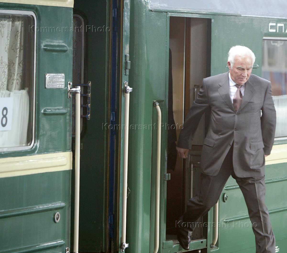 The press-secretary of the Russian President Alexei Gromov (left) comes out of the vagon during the ceremony of the opening of the Ladozhsky railway station.