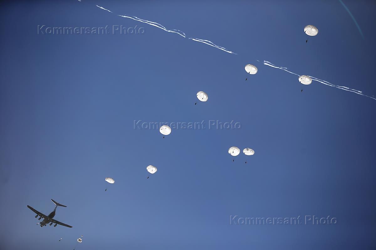 Командно-штабные учения с соединением Воздушно-десантных войск (ВДВ) прошли в Псковской области. Военнослужащие во время десантирования.