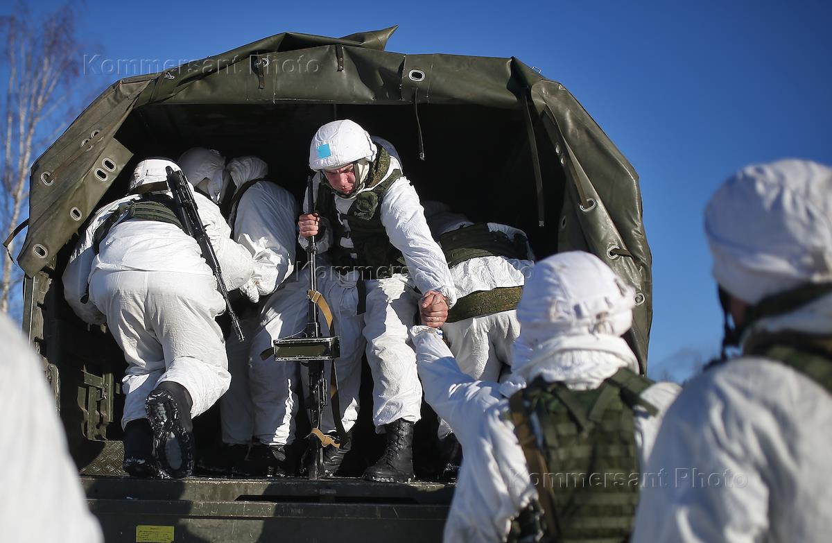 Командно-штабные учения с соединением Воздушно-десантных войск (ВДВ) прошли в Псковской области. Жанровая фотография. Собаки и десантники в маскировочной зимней форме.