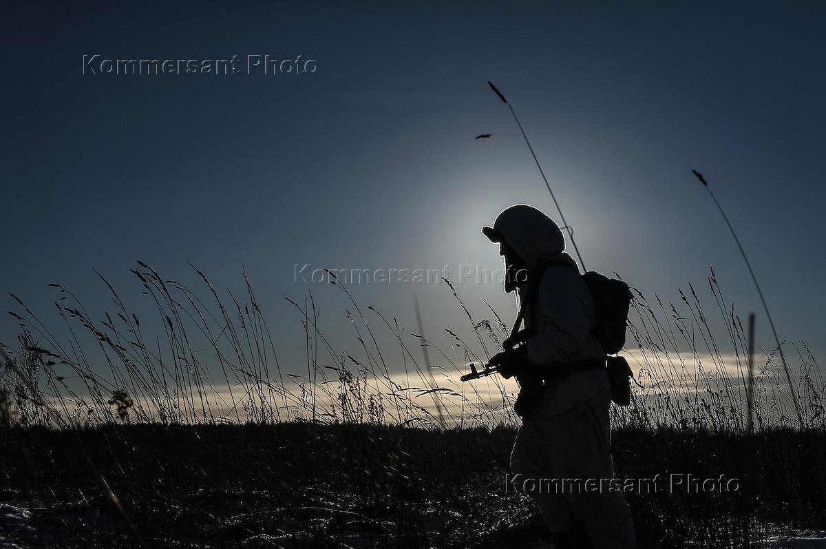 Командно-штабные учения с соединением Воздушно-десантных войск (ВДВ) прошли в Псковской области. Жанровая фотография. Собаки и десантники в маскировочной зимней форме.