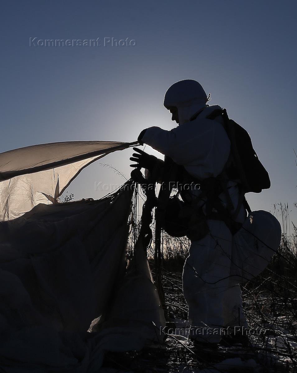 Командно-штабные учения с соединением Воздушно-десантных войск (ВДВ) прошли в Псковской области. Военнослужащий после десантирования.