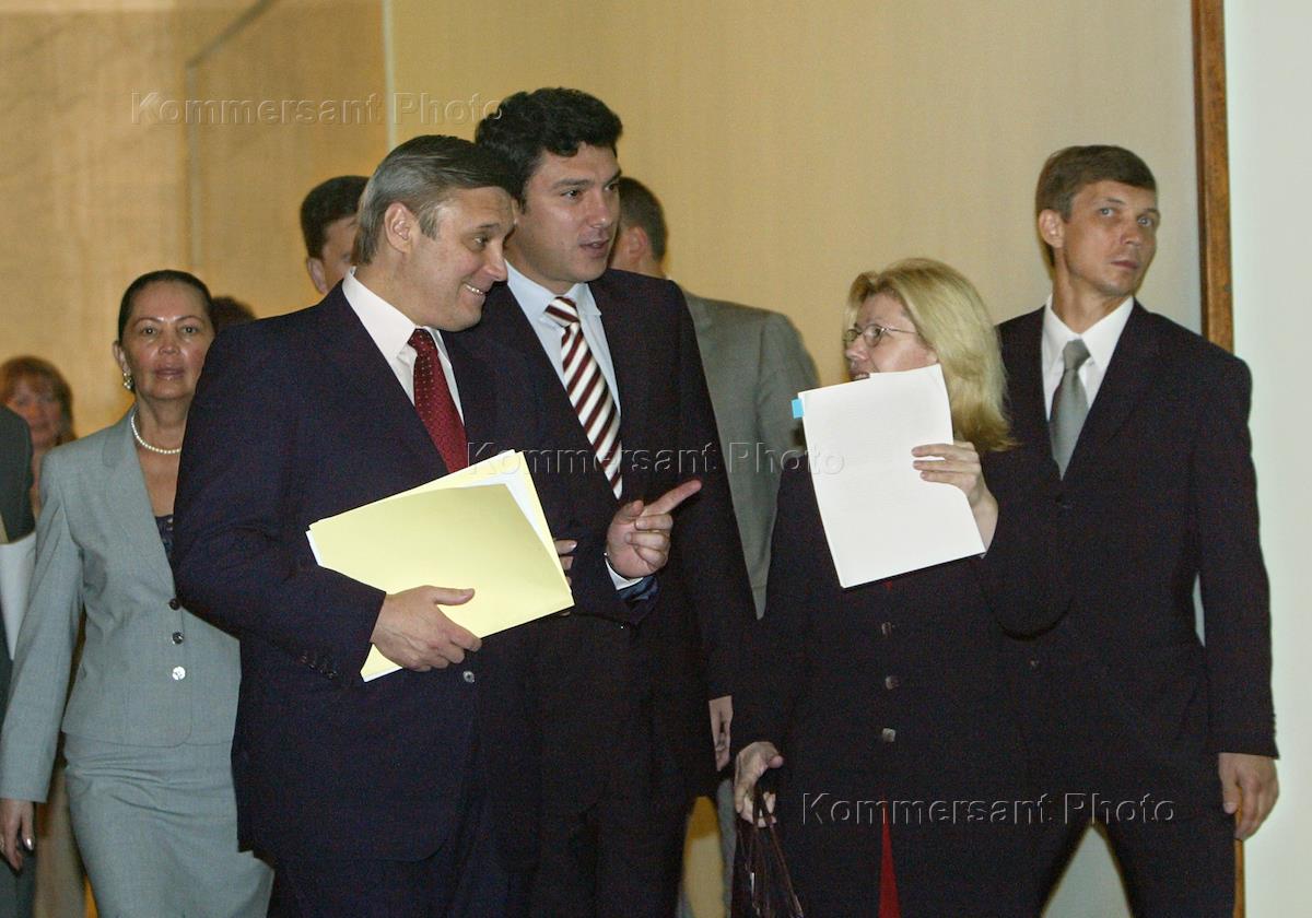 Лидер Союза правых сил (СПС), депутат Государственной Думы России Борис Немцов (слева) и Председатель Правительства России Михаил Касьянов (справа) в перерыве думского заседания.