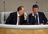 Министр строительства и жилищно-коммунального хозяйства России Михаил Мень (слева) и заместитель председателя правительства России Дмитрий Козак (справа) на пленарном заседании Государственной думы России.