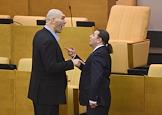 Первый заместитель председателя Государственной думы России Иван Мельников (слева) и член комитета Государственной думы России по науке и наукоемким технологиям Жорес Алферов (справа) на пленарном заседании Госдумы России.