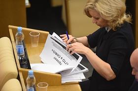 Председатель комитета Государственной думы (ГД) России по делам общественных объединений и религиозных организаций Ярослав Нилов (в центре) и первый заместитель председателя комитета ГД по информационной политике, информационным технологиям и связи Вадим Деньгин (справа) во время пленарного думского заседания.
