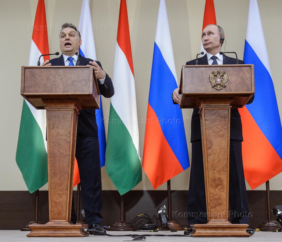 Премьер-министр Венгрии Виктор Орбан (слева) и президент России Владимир Путин (справа) во время совместной пресс-конференции в подмосковной резиденции Ново-Огарево.