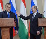 Премьер-министр Венгрии Виктор Орбан (слева) и президент России Владимир Путин (справа) во время совместной пресс-конференции в подмосковной резиденции Ново-Огарево.