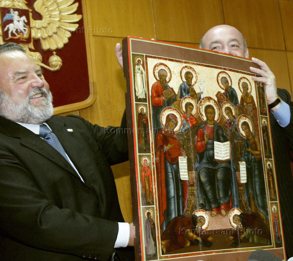 Russian Culture Minister Mikhail Shvydkoy (right) displays old Orthodox icons, which had been illegally smuggled out of the country and eventually returned to Russia by the Italian government.