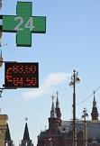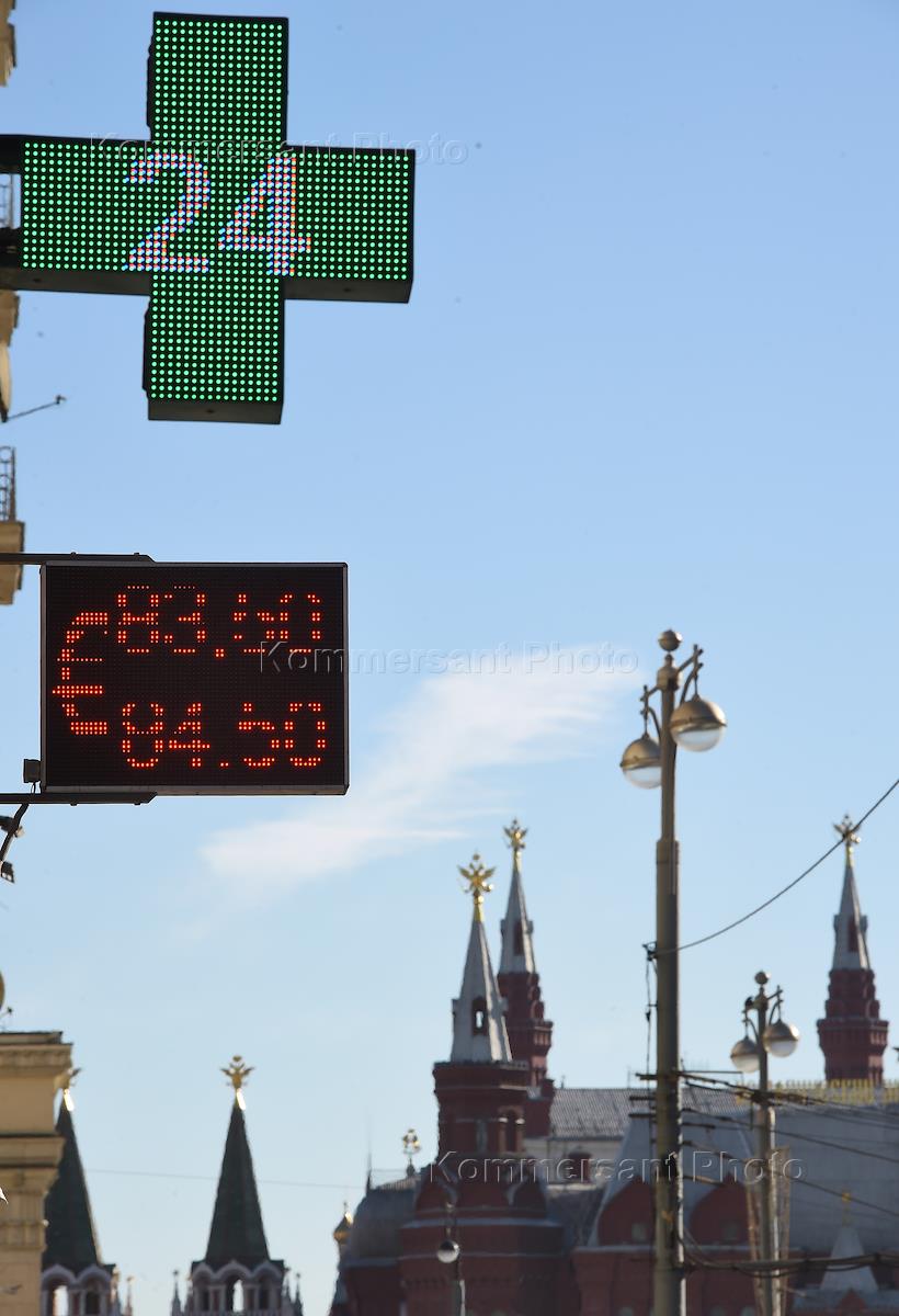Жанровая фотография. Электронное табло обменного пункта с курсом евро на Тверской улице.
