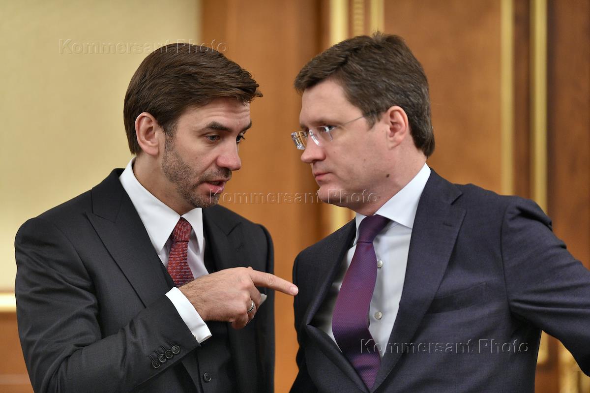 Министр России по связям с Открытым правительством Михаил Абызов (слева) и министр энергетики России Александр Новак (справа) во время заседания правительства России.