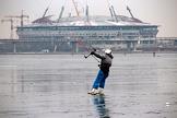 Строящийся стадион на Крестовском острове, на котором будут проходить проходить игры чемпионата мира по футболу 2018. Кайтсерфер на льду Финского залива.
