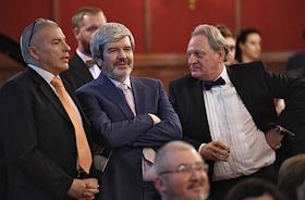 Церемония вручения Национальной премии в области развития общественных связей "Серебряный лучник". Слева направо: заместитель председателя Правления концерна "Шелл", президент АКАР Игорь Игнатьев президент Ассоциации строителей России (АСР) Николай Кошман и уполномоченный при президенте России по защите прав предпринимателей Борис Титов на церемонии в отеле "Метрополь".