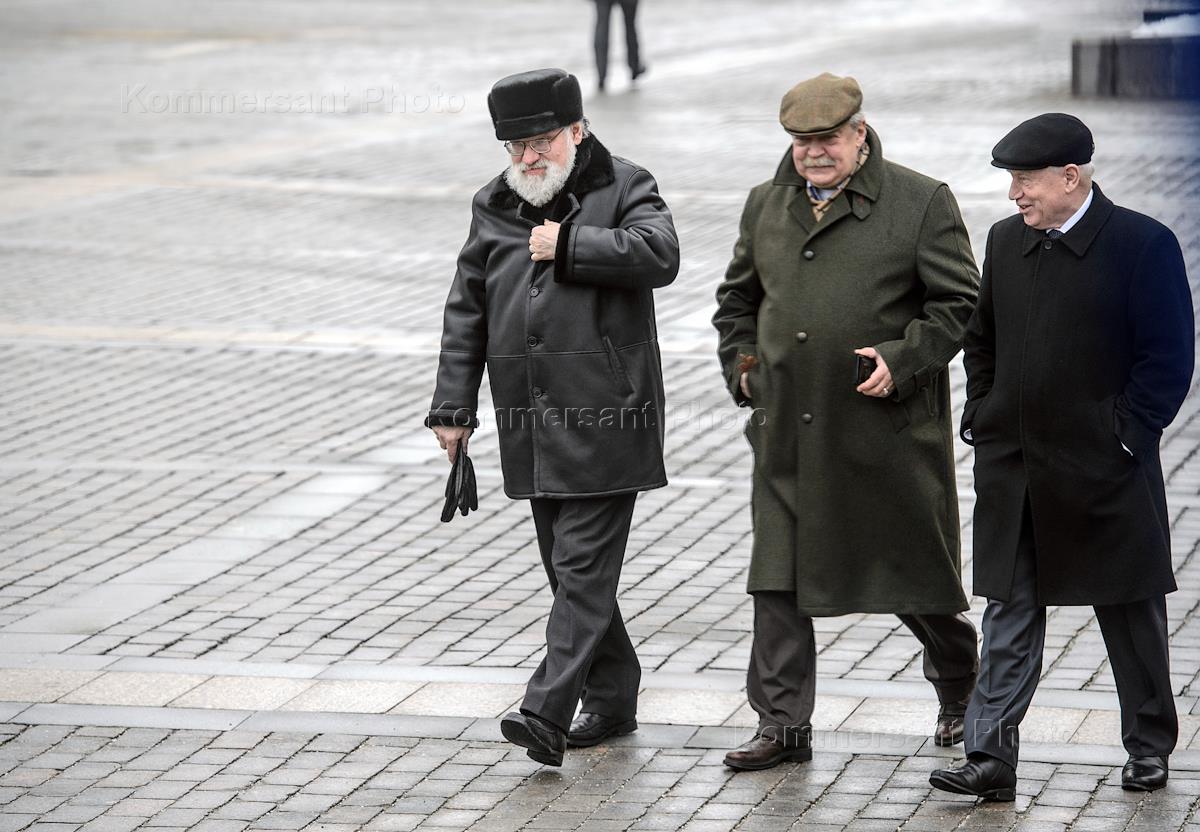 Chairman of the Russian government Dmitry Medvedev, President of Russia Vladimir Putin, Minister of defence of Russia Sergey Shoygu and head of the administration of the President of Russia Sergey Ivanov (from left to right) are during the ceremony of laying flowers in front of the grave of the Unknown Soldier by the Kremlin wall in Defender's Day.