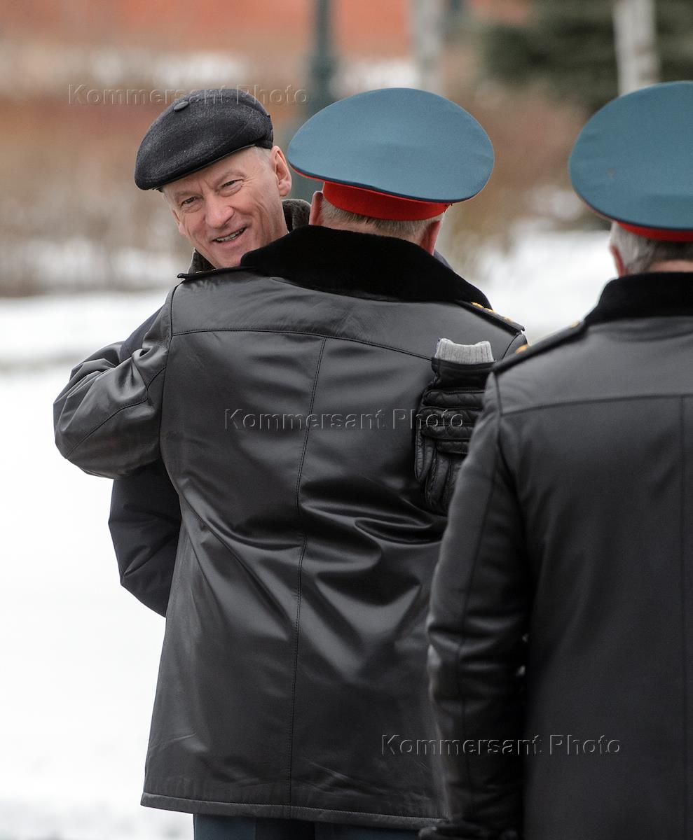 Секретарь Совета безопасности России Николай Патрушев (слева) перед началом церемонии возложения цветов к Могиле Неизвестного Солдата у Кремлевской стены в День защитника Отечества.