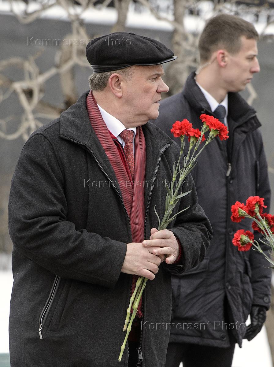 Лидер Коммунистической партии России (КПРФ) Геннадий Зюганов (слева) во время церемонии возложения цветов к Могиле Неизвестного Солдата у Кремлевской стены в День защитника Отечества.