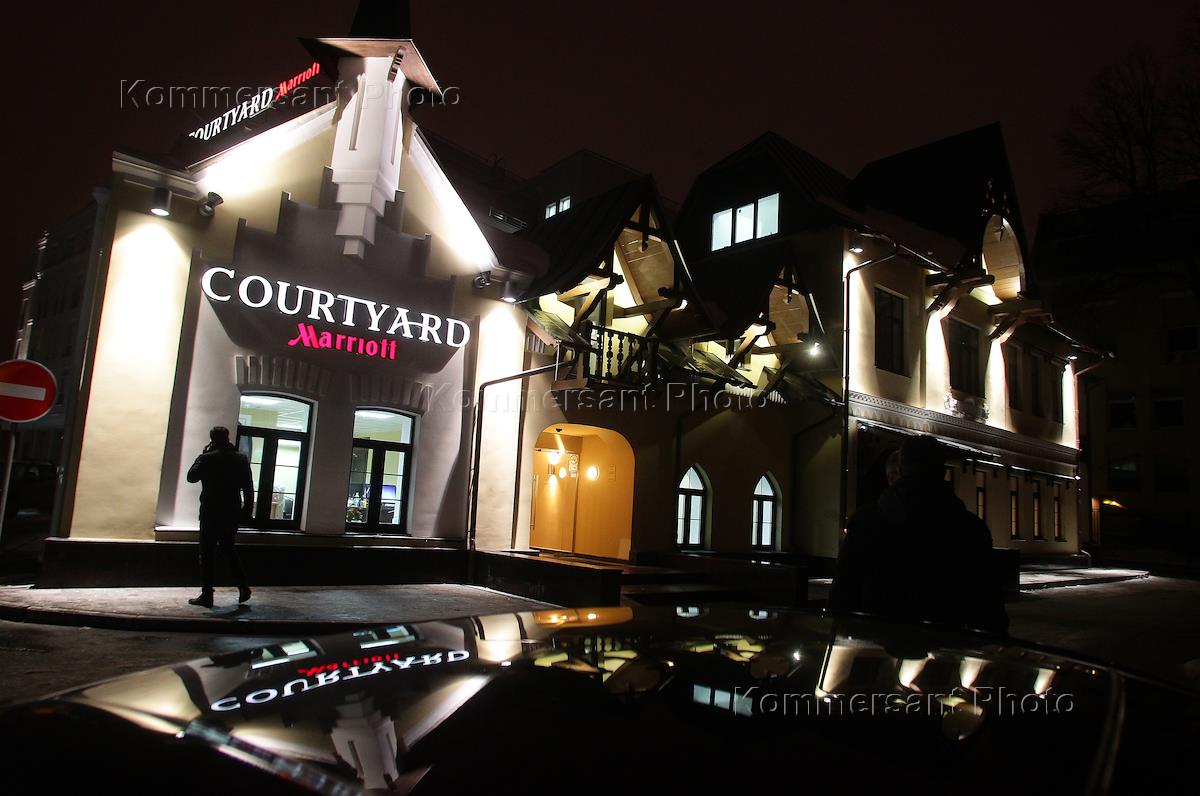 Жанровая фотография. Работница комплексной уборки во время чистки ковра пылесосом перед микрофонами.