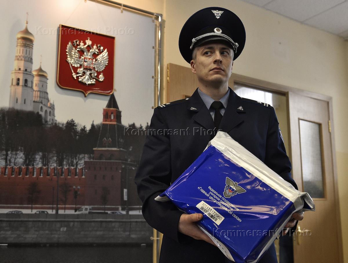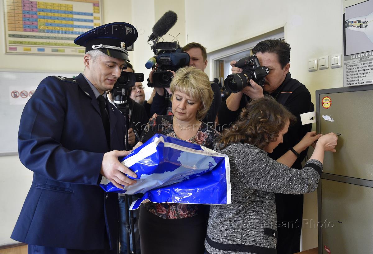 Проведение пробного ЕГЭ по математике базового уровня, с участием представители СМИ и общественности. Служащий Государственной фельдъегерской службы России с заданиями экзамена.