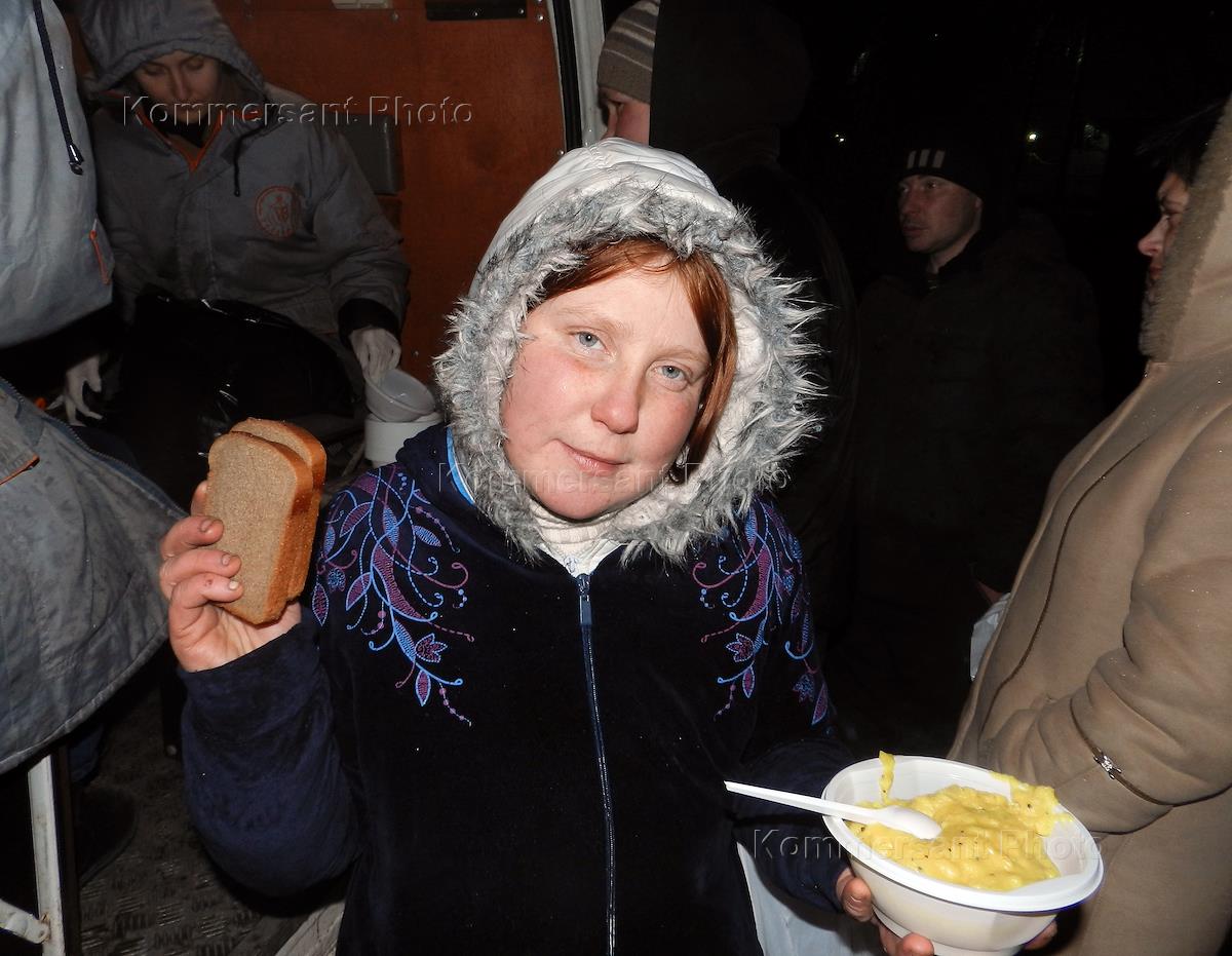 Граждане без определенного места жительства получают бесплатную еду во дворе центра для бездомных "Ночлежка".