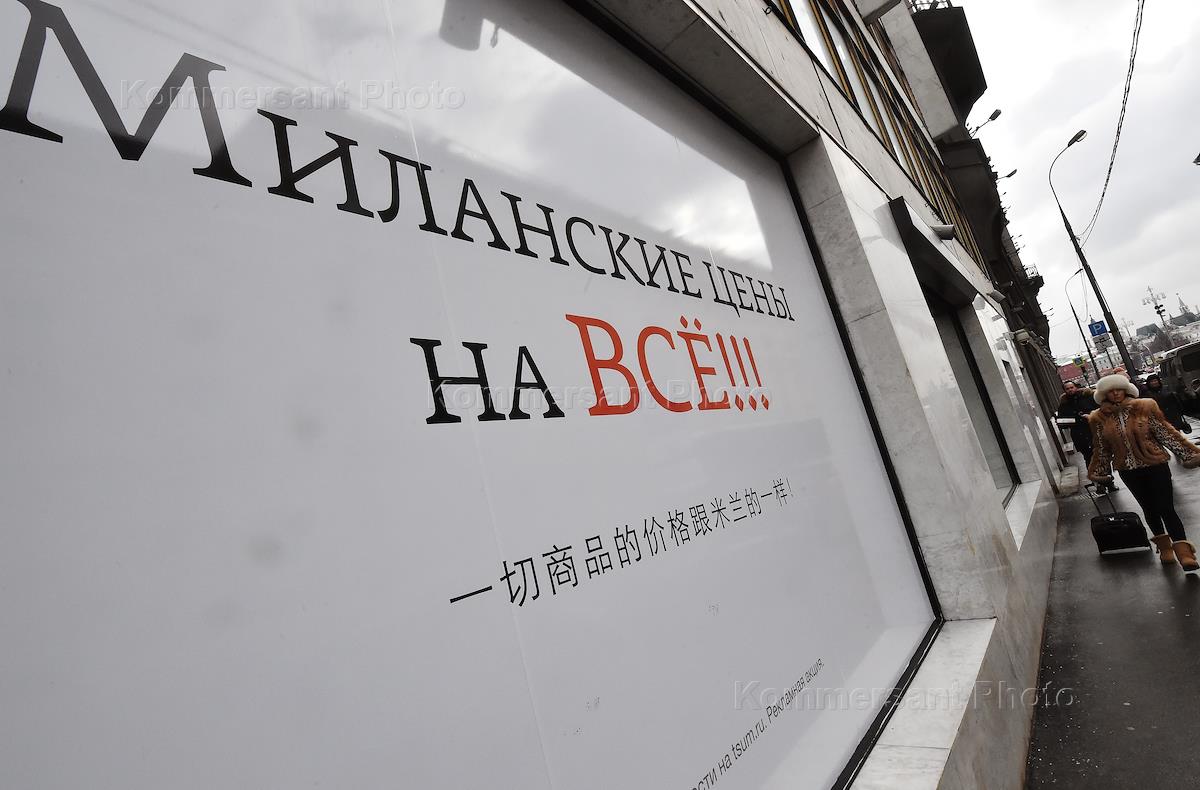 The scenic photograph. Advertisement in the shop-window of shopping mall TsUM 'Milan prices for everyting'.