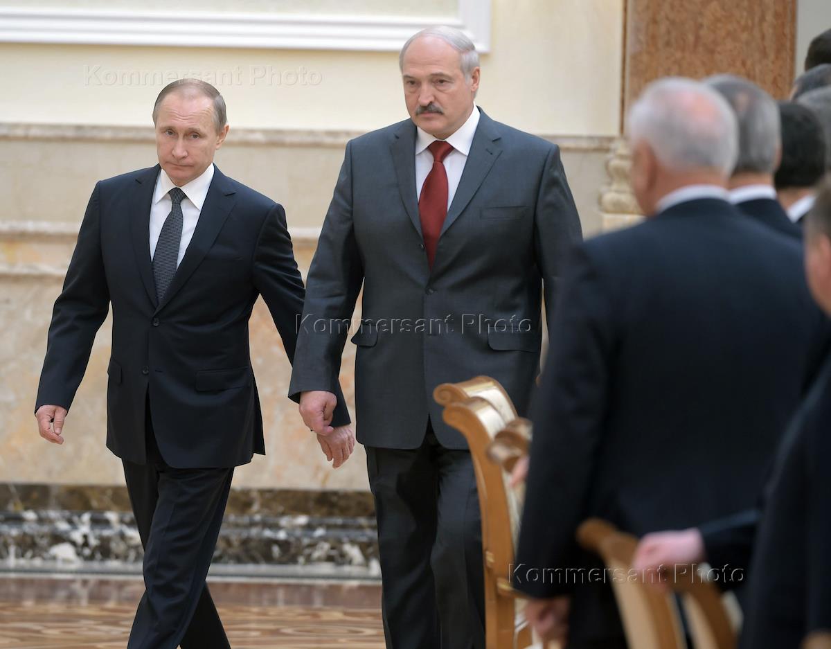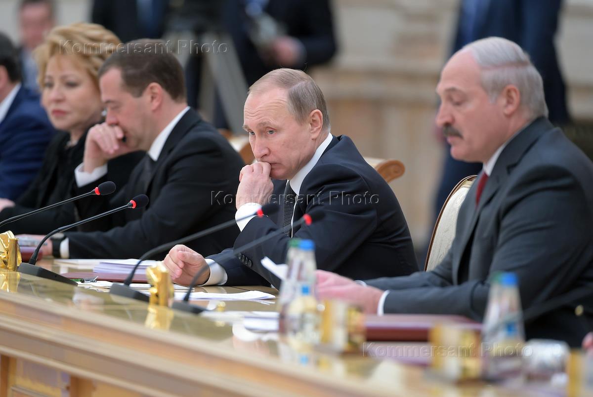 Рабочая поездка президента России Владимира Путина в Минск. Президент России Владимир Путин (справа) и президент Белоруссии Александр Лукашенко (слева) на заседании Высшего Государственного Совета Союзного государства России и Белоруссии.