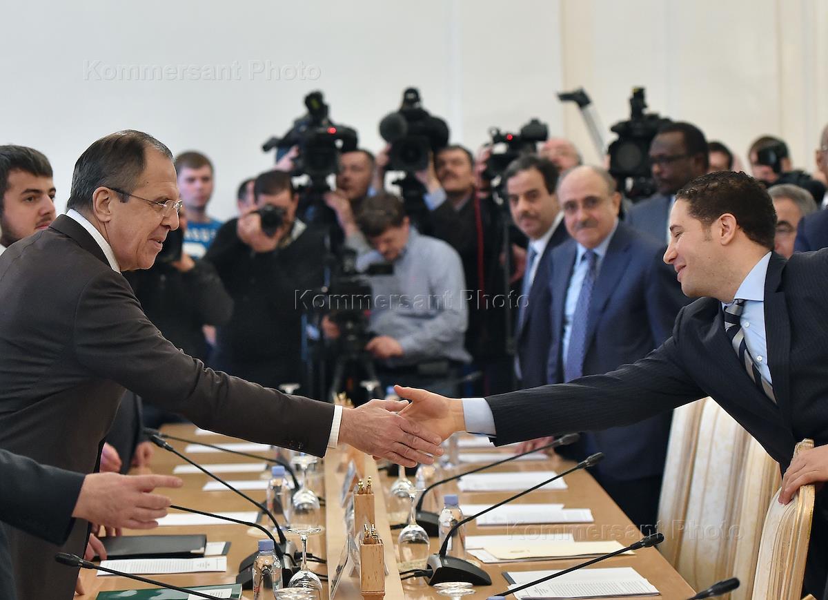 Министр иностранных дел Ливии Мухаммад Ад-Дайри (справа) перед началом заседания Российско-арабского форума в Доме приемов МИД России.