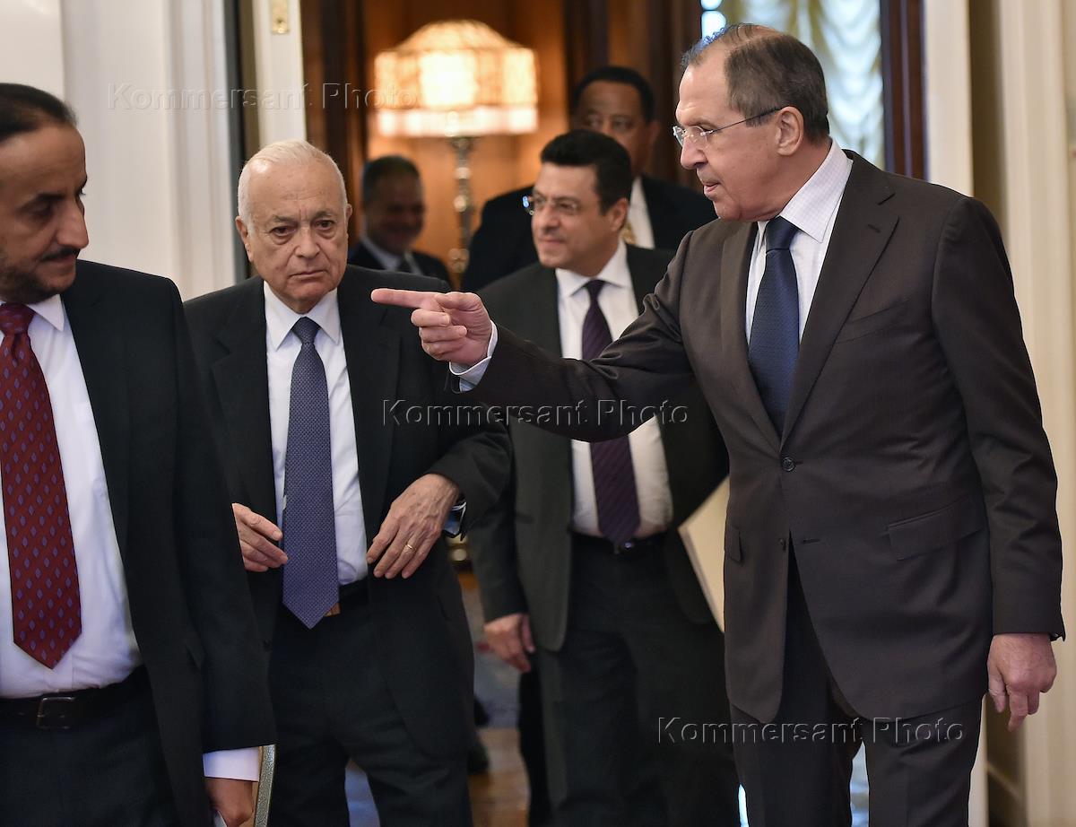 Генеральный секретарь Лиги арабских государств (ЛАГ) Набиль аль-Араби (второй слева) и министр иностранных дел России Сергей Лавров (справа) перед началом заседания Российско-арабского форума в Доме приемов МИД РФ.