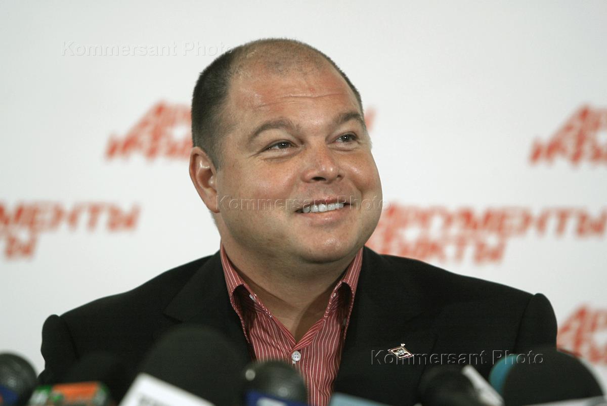 President of the Spartak (Moscow) football club Andrey Chervichenko is interviewed at the news conference summoned to announce that the team's chief coach Oleg Romantsev would be replaced. The news conference was held in the AIF-Novosti news agency.