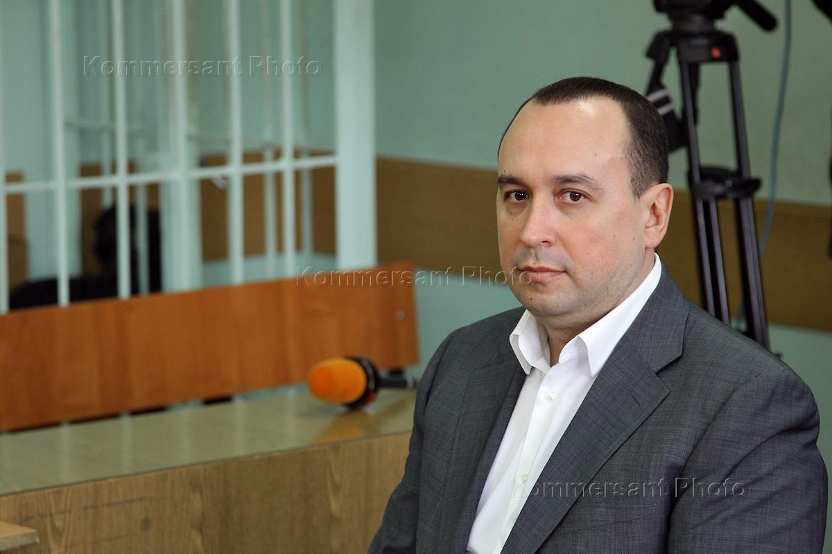 Бывший министр поддержки и развития малого предпринимательства, потребительского рынка и услуг Нижегородской области Денис Лабуза (справа), обвиняемый в организации незаконной миграции, во время судебного процесса.