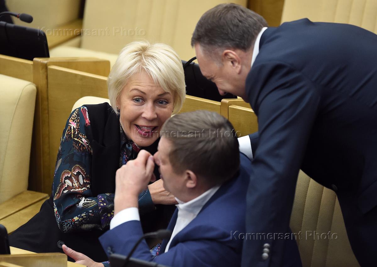 Заместитель председателя комитета Государственной думы (ГД) России по аграрным вопросам Надежда Школкина (слева) и член комитета ГД по природным ресурсам, природопользованию и экологии Дмитрий Савельев (справа) во время заседания Госдумы.