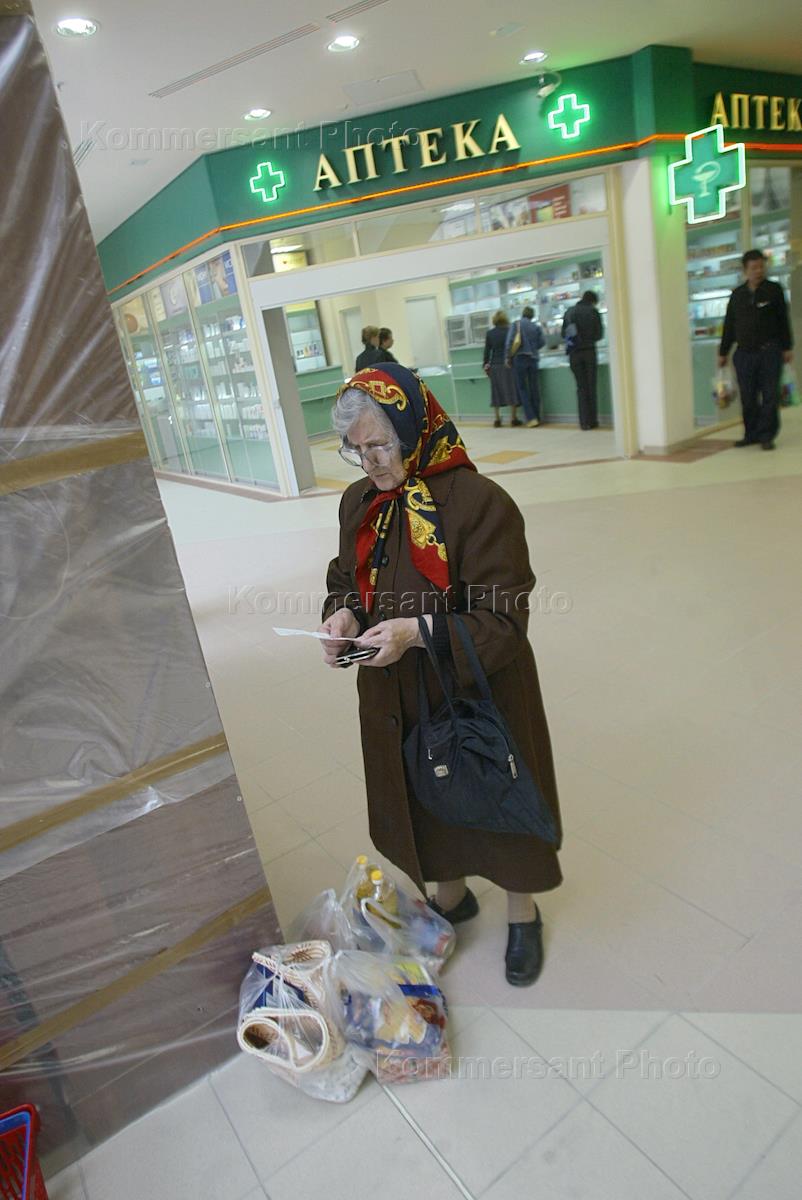 An old woman reads an advertising leaflet in the Mosmart hyper-market.