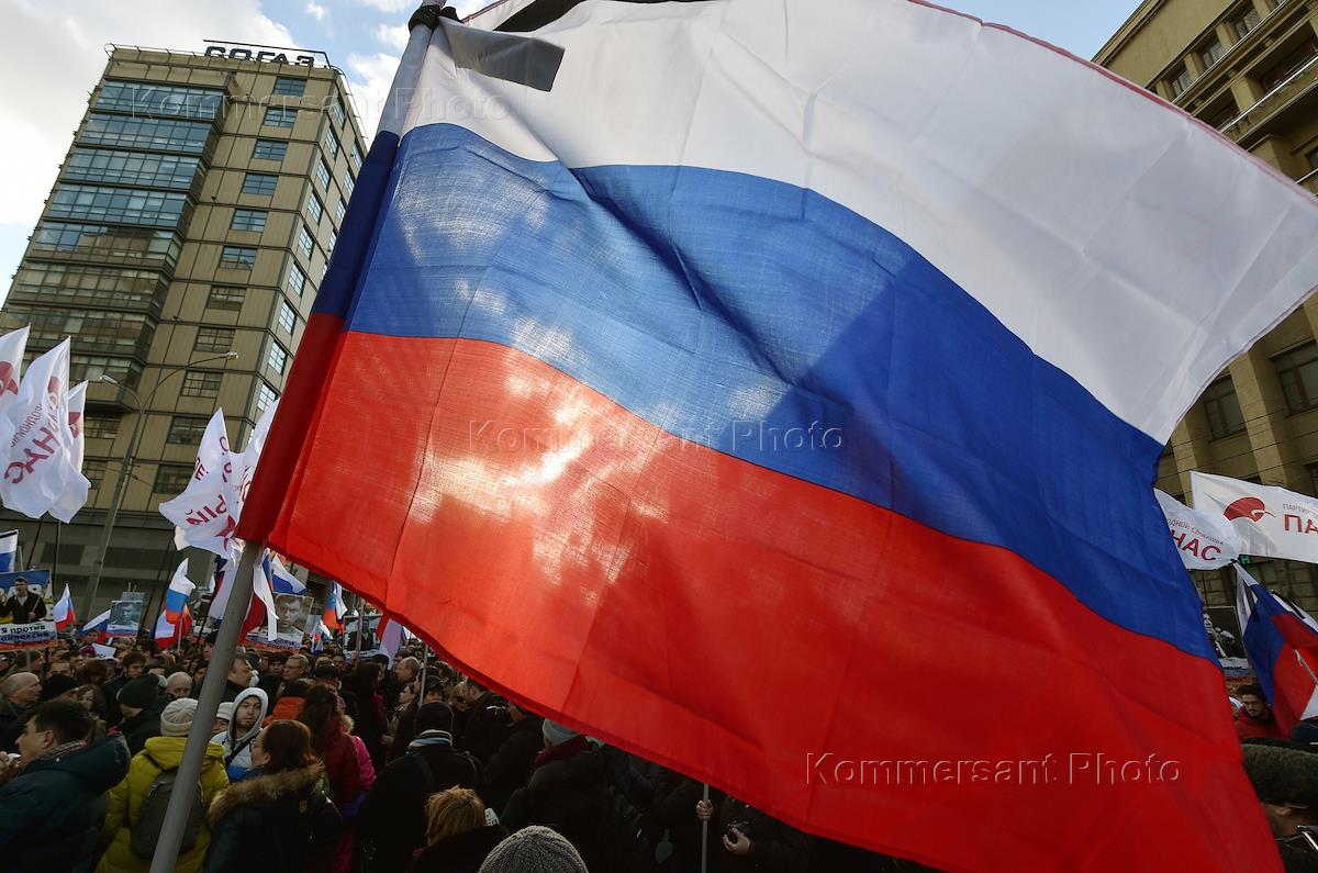 Участники марша памяти, посвященного годовщине убийства политика, общественного деятеля Бориса Немцова на Большом Москворецком мосту на месте убийства.