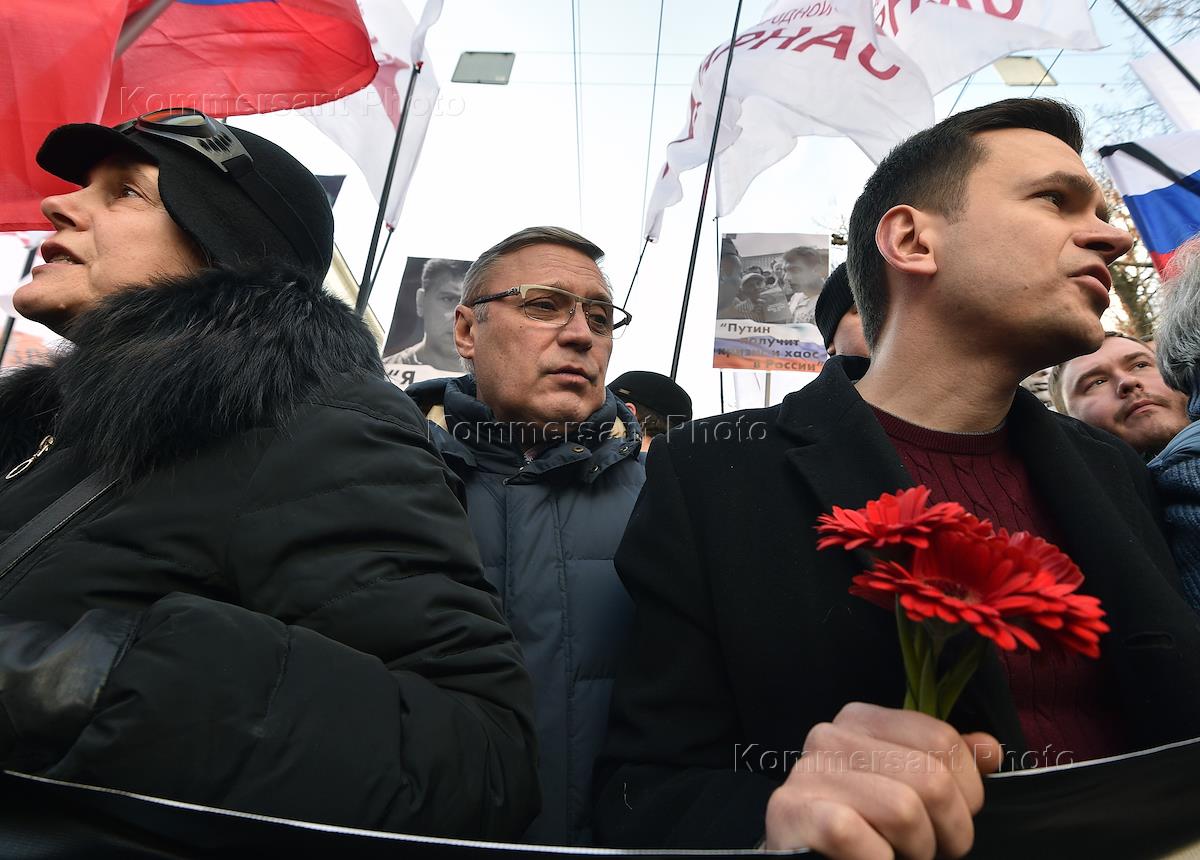Политик Геннадий Гудков (в центре) на марше памяти, посвященного годовщине убийства политика, общественного деятеля Бориса Немцова, по Бульварному кольцу от Страстного бульвара до Проспекта Сахарова.