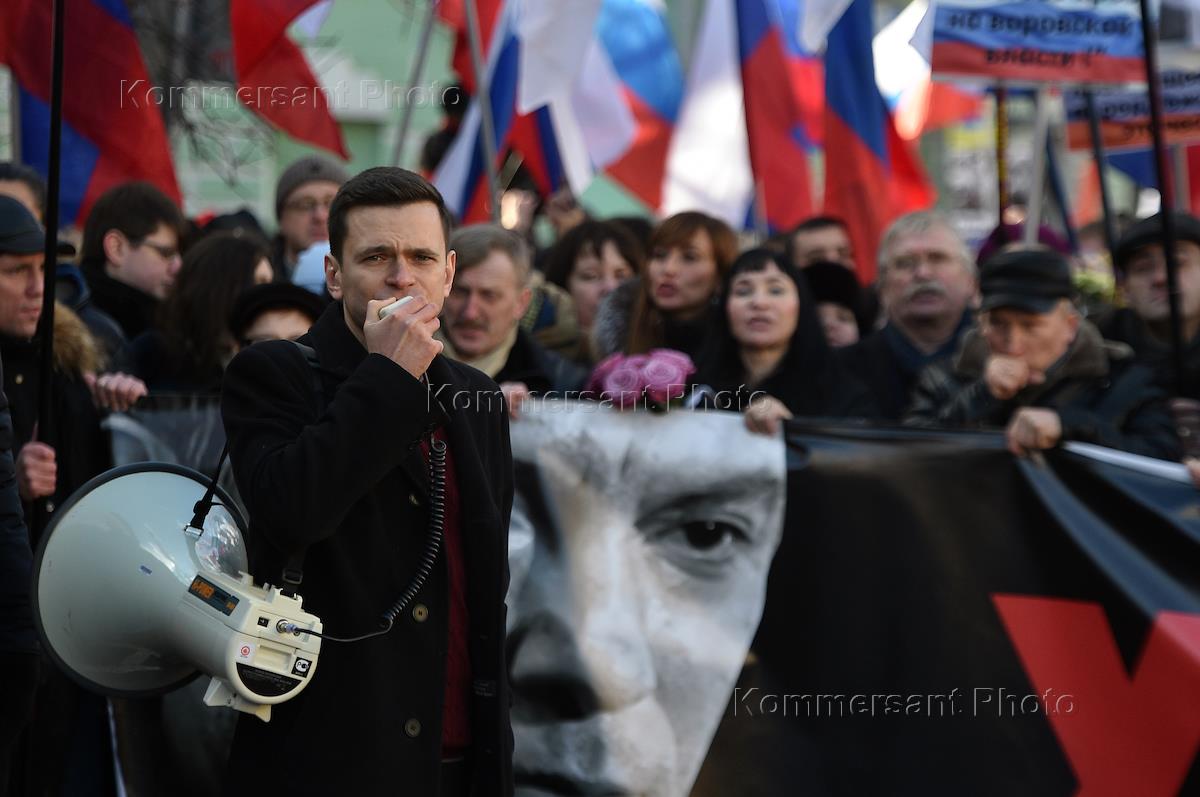 Член бюро движения "Солидарность" Илья Яшин на марше памяти, посвященного годовщине убийства политика, общественного деятеля Бориса Немцова, по Бульварному кольцу от Страстного бульвара до Проспекта Сахарова.