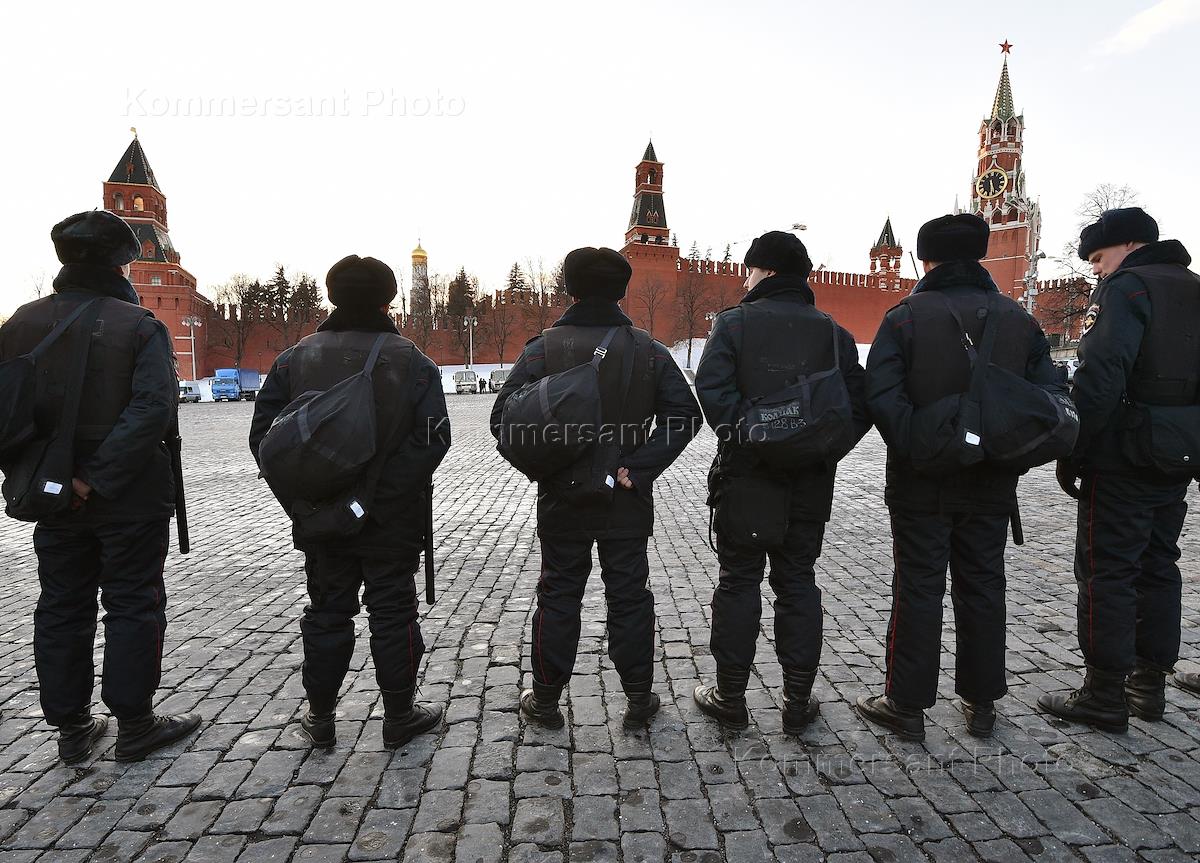 Сотрудники полиции во время оцепления места проведения марша памяти, посвященного годовщине убийства политика, общественного деятеля Бориса Немцова, по Бульварному кольцу от Страстного бульвара до Проспекта Сахарова.