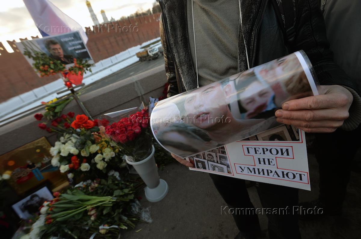 People are laying flowers on the site of murder of politician, social activist Boris Nemtsov in the death anniversary on Bolshoy Moskvoretsky Bridge.