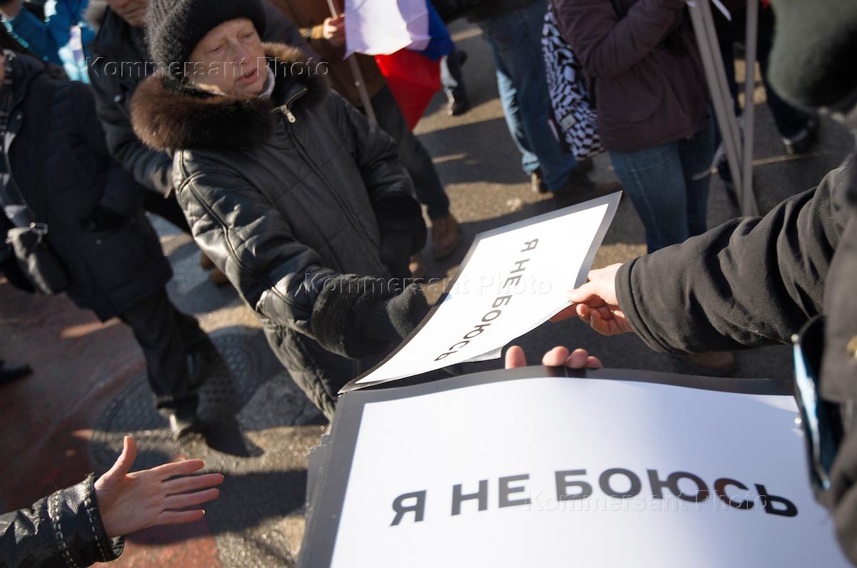 Participants of the remembrance march, devoted to the death anniversary of politician, social activist Boris Nemtsov are walking on the Boulevard Ring from the Strastnoy Boulevard to the Academician Sakharov Avenue. Poster with inscription 'I am not afraid'