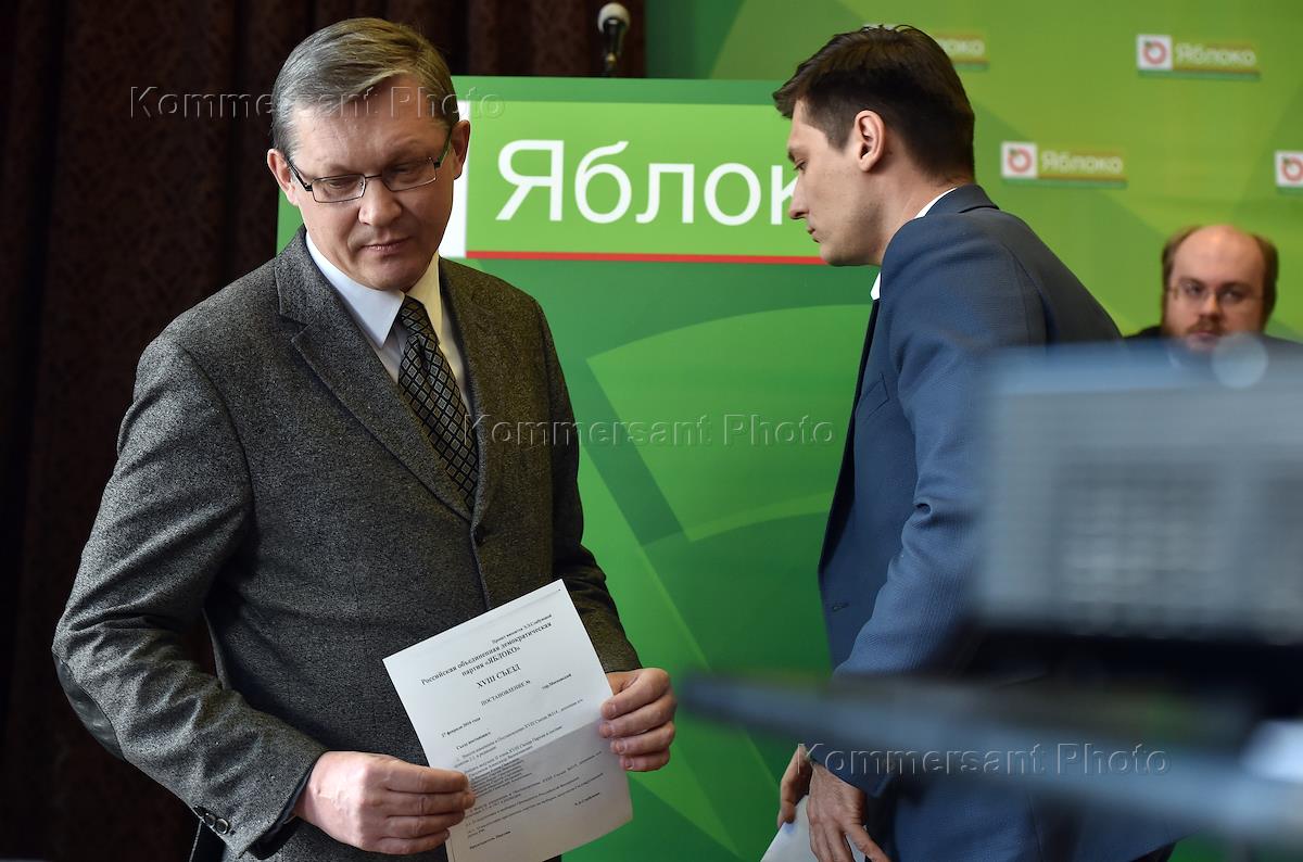 The 18th congress of party 'Yabloko'. Chairman of social movement 'Choice of Russia' Vladimir Ryzhkov (left) and member of the constitutional legislation and state building committee of the Russian State Duma Dmitry Gudkov 9in the centre) are at the congress in the research guidance center of the trade union of workers of APK.
