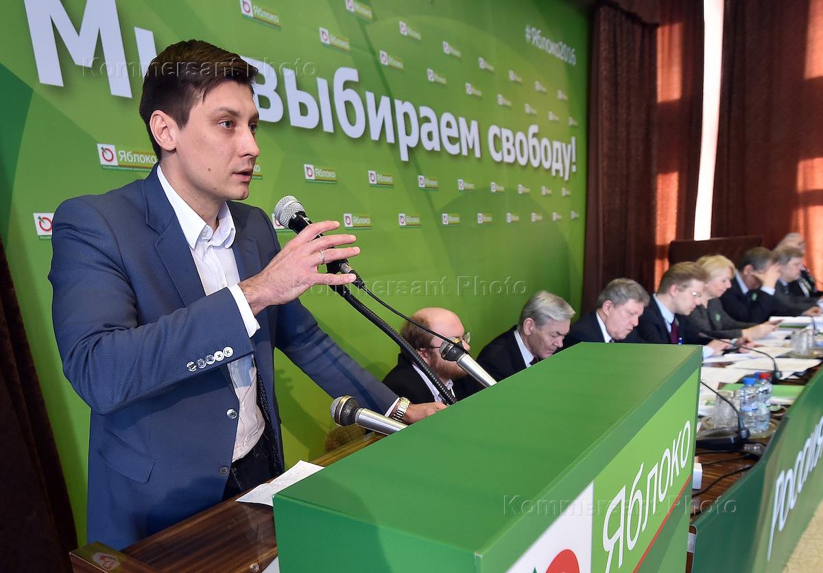 The 18th congress of party 'Yabloko'. Member of the constitutional legislation and state building committee of the Russian State Duma Dmitry Gudkov is at the congress in the research guidance center of the trade union of workers of APK.