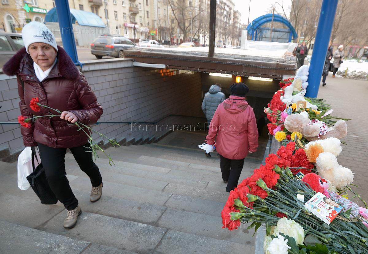 People are bringing flowers and toys in remembrance of the murdered girl to the entrance of metro station 'Oktyabrskoye pole'.