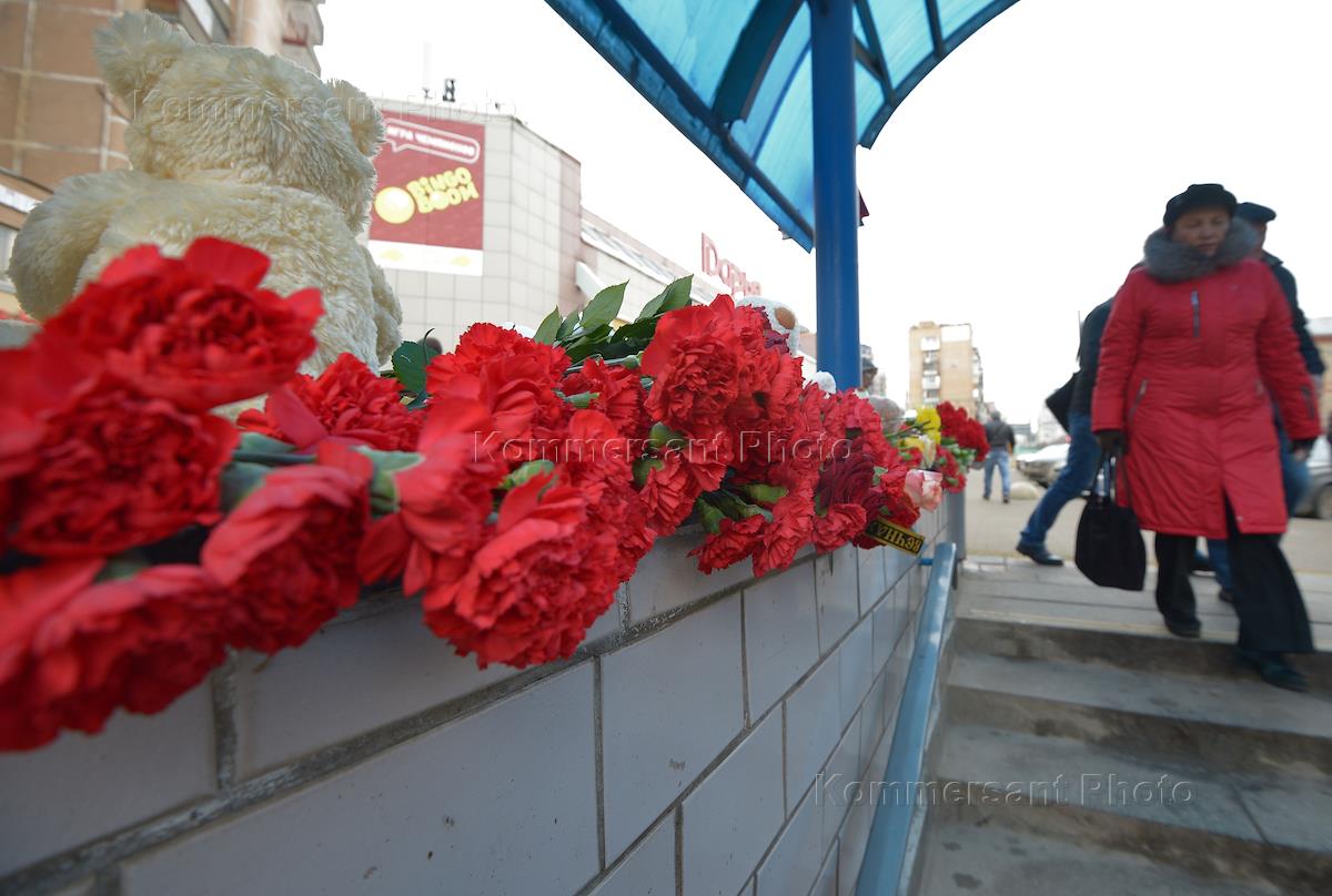 People are bringing flowers and toys in remembrance of the murdered girl to the entrance of metro station 'Oktyabrskoye pole'.