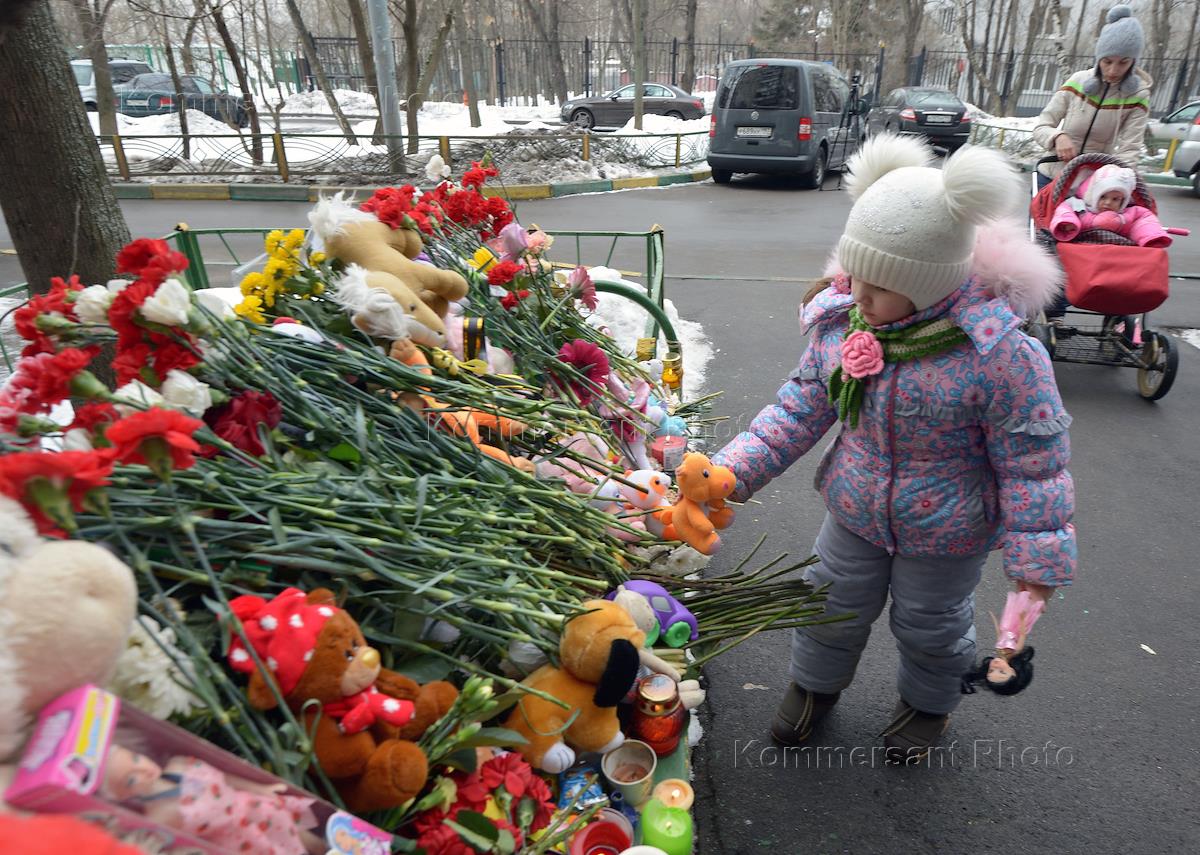 People are bringing flowers and toys in remembrance of the murdered girl to the entrance of metro station 'Oktyabrskoye pole'.