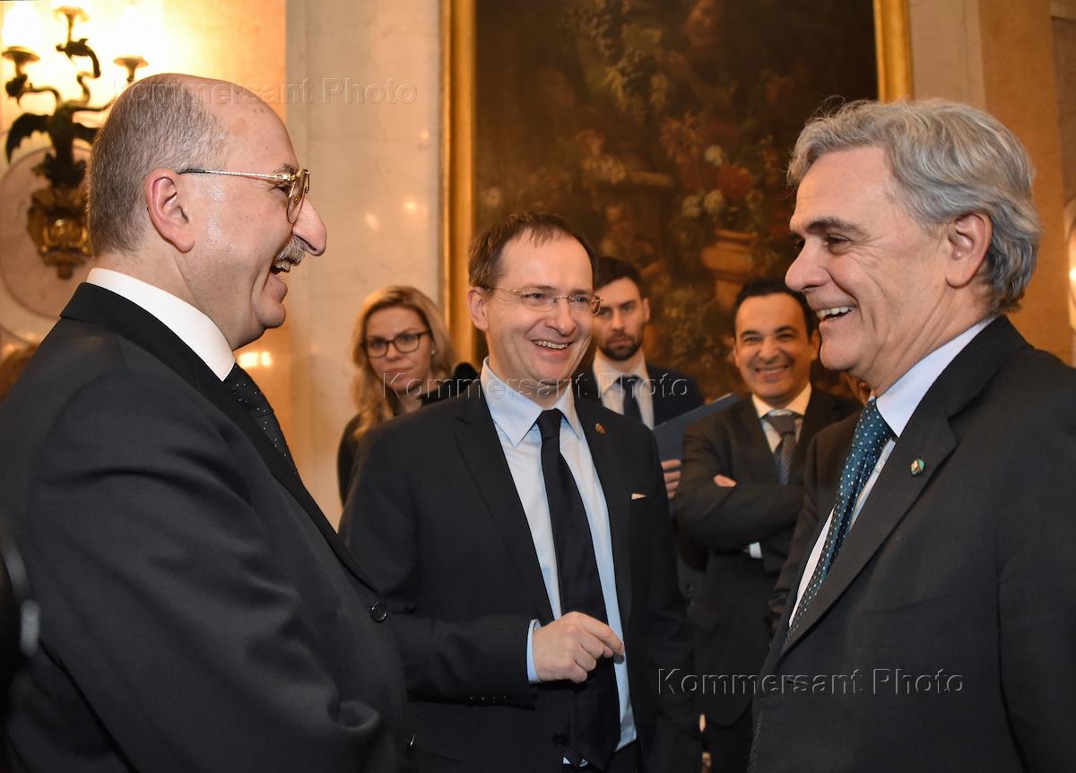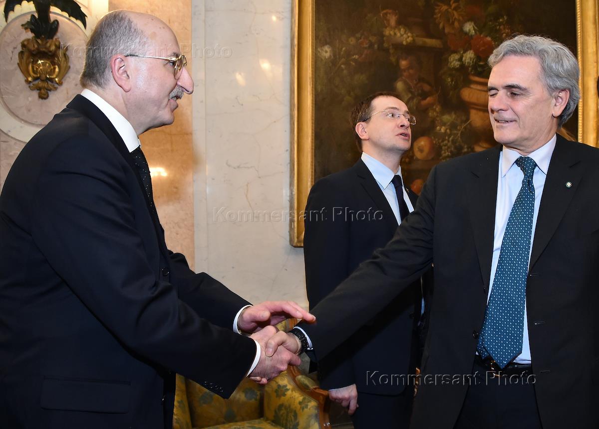 Специальный представитель Президента России по международному культурному сотрудничеству Михаил Швыдкой (слева) и первый заместитель генерального директора ИТАР-ТАСС Михаил Гусман (справа) на церемонии вручения ордена "За заслуги перед Итальянской республикой" степени офицера Давиду Якобашвили. Церемония прошла в Особняке Берга.
