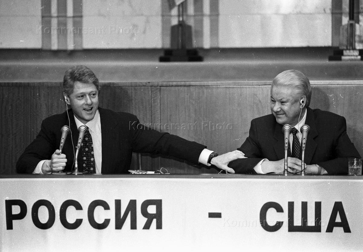 Президент России Борис Ельцин (справа) во время встречи с президентом США Биллом Клинтоном (слева).