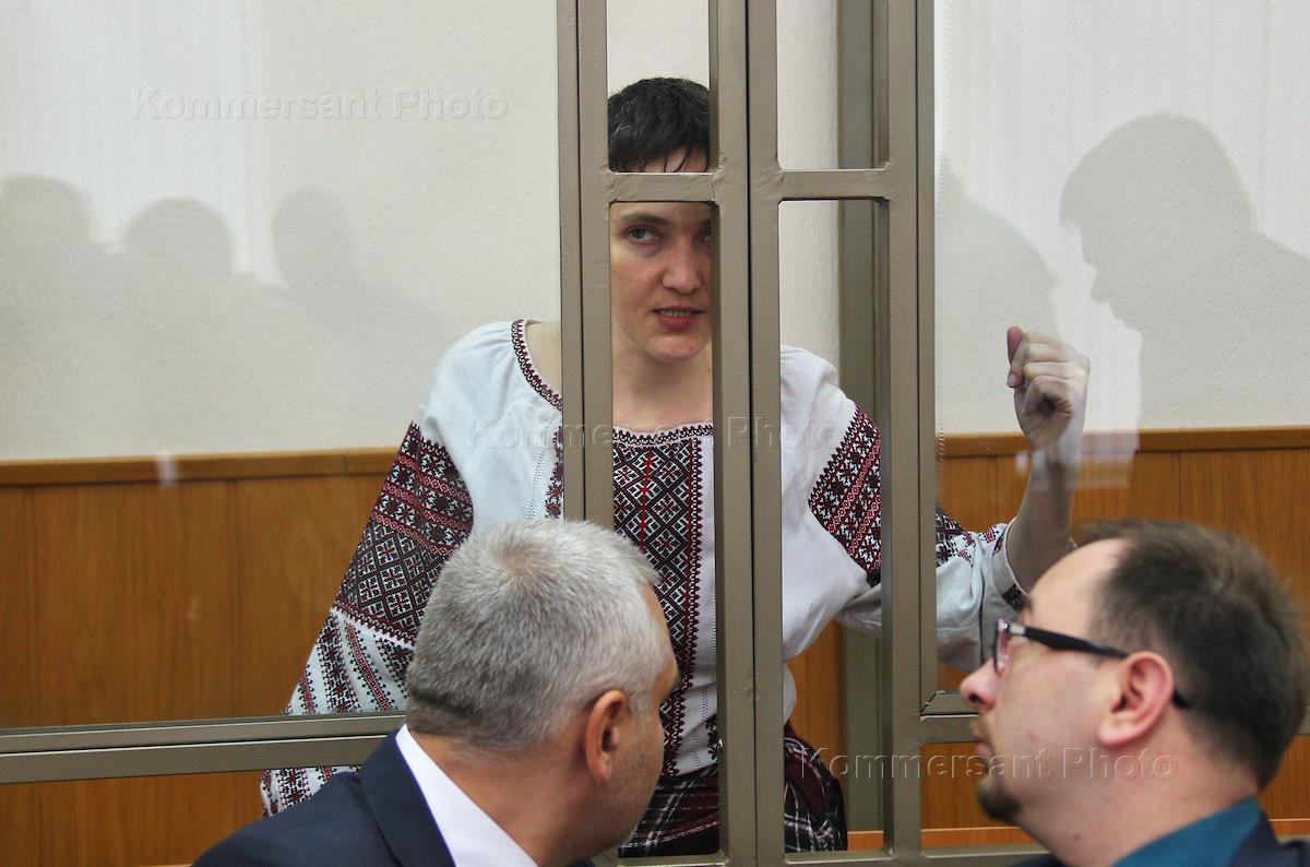 Ukrainian military woman Nadezhda Savchenko, accused of murder of Russian journalists in Donbass, is during the sitting of the Donetsk district court of the Rostov region.