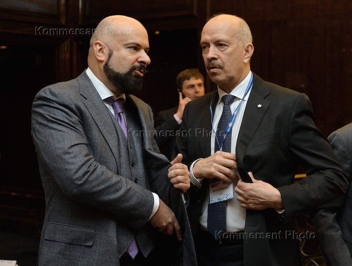 День авиации МАТА/IATA (Международная ассоциация воздушного транспорта / International Air Transport Associationв) прошел в гостинице Ritz-Carlton. Заместитель министра транспорта России Валерий Окулов (слева) и генеральный директор ОАО "Аэрофлот — российские авиалинии" Виталий Савельев (справа) во время мероприятий Дня авиации МАТА/IATA.