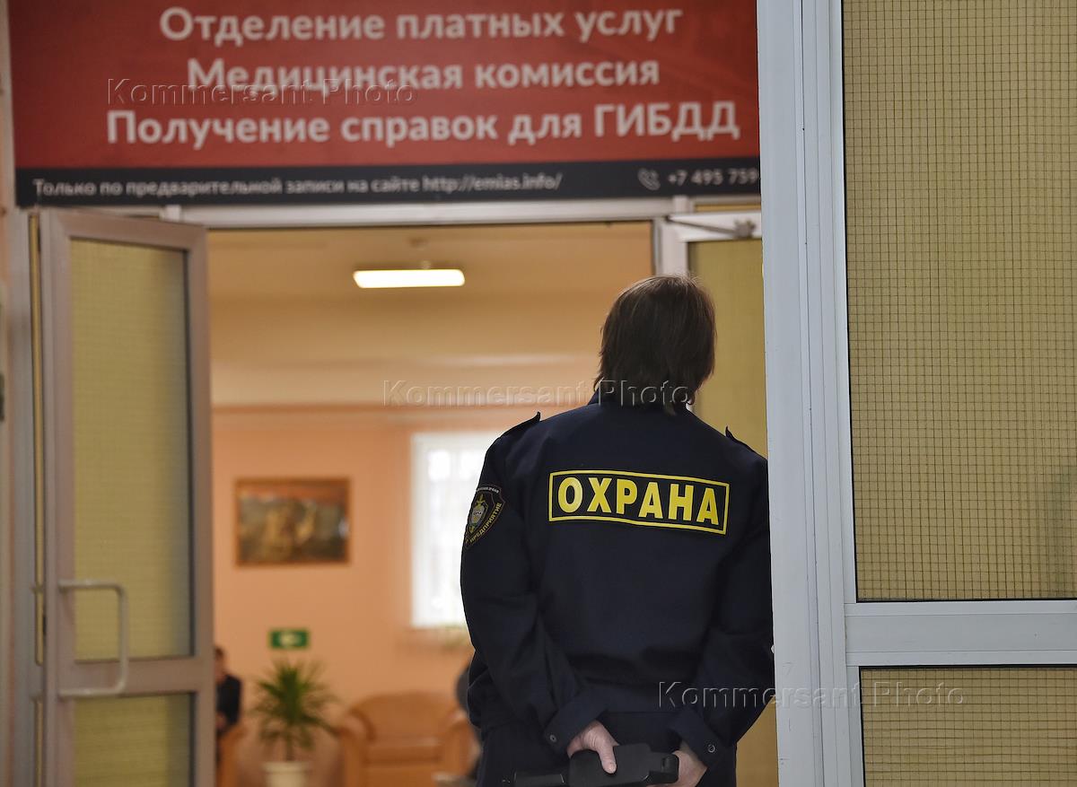 Жанровая фотография. Сотрудник охраны в городской поликлинике №10 в Красногорске.