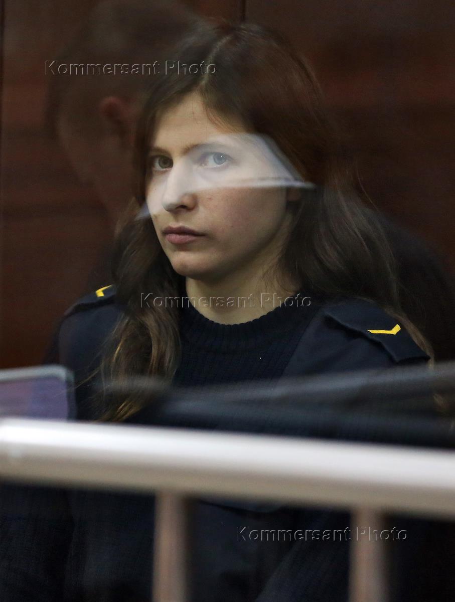 Лидер движения "Русские СПб" Дина Гарина, обвиняемая в разжигании ненависти посредством социальных сетей, во время оглашения приговора у Кировского районного суда Санкт-Петербурга. Дина Гарина получила условный срок.
