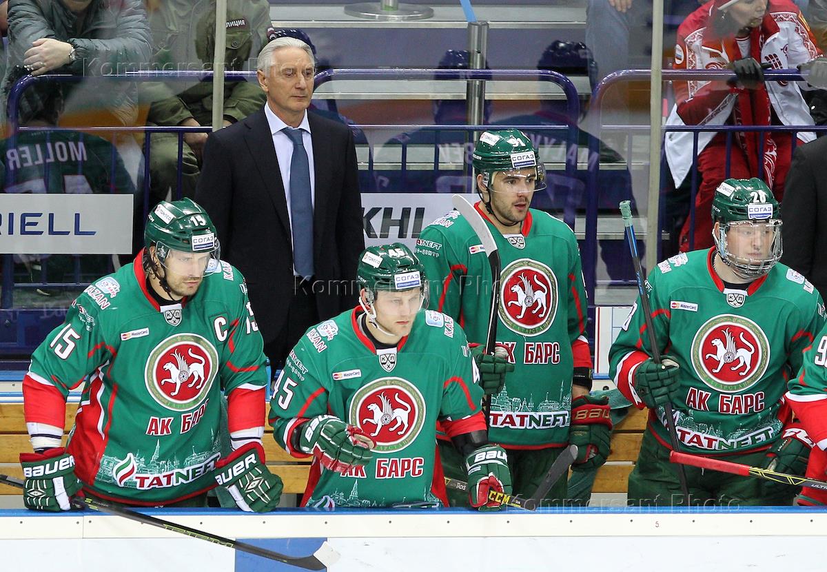 Континентальная хоккейная лига (КХЛ). Кубок Гагарина 2016. 1\8 финала. Матч между командами "Ак Барс" (Казань) и "Салават Юлаев" (Уфа). Слева направо, команда "АК Барс": игрок Александр Свитов, главный тренер Зинэтула Билялетдинов, игроки Оскар Меллер, Дмитрий Архипов и Денис Голубев во время матча.