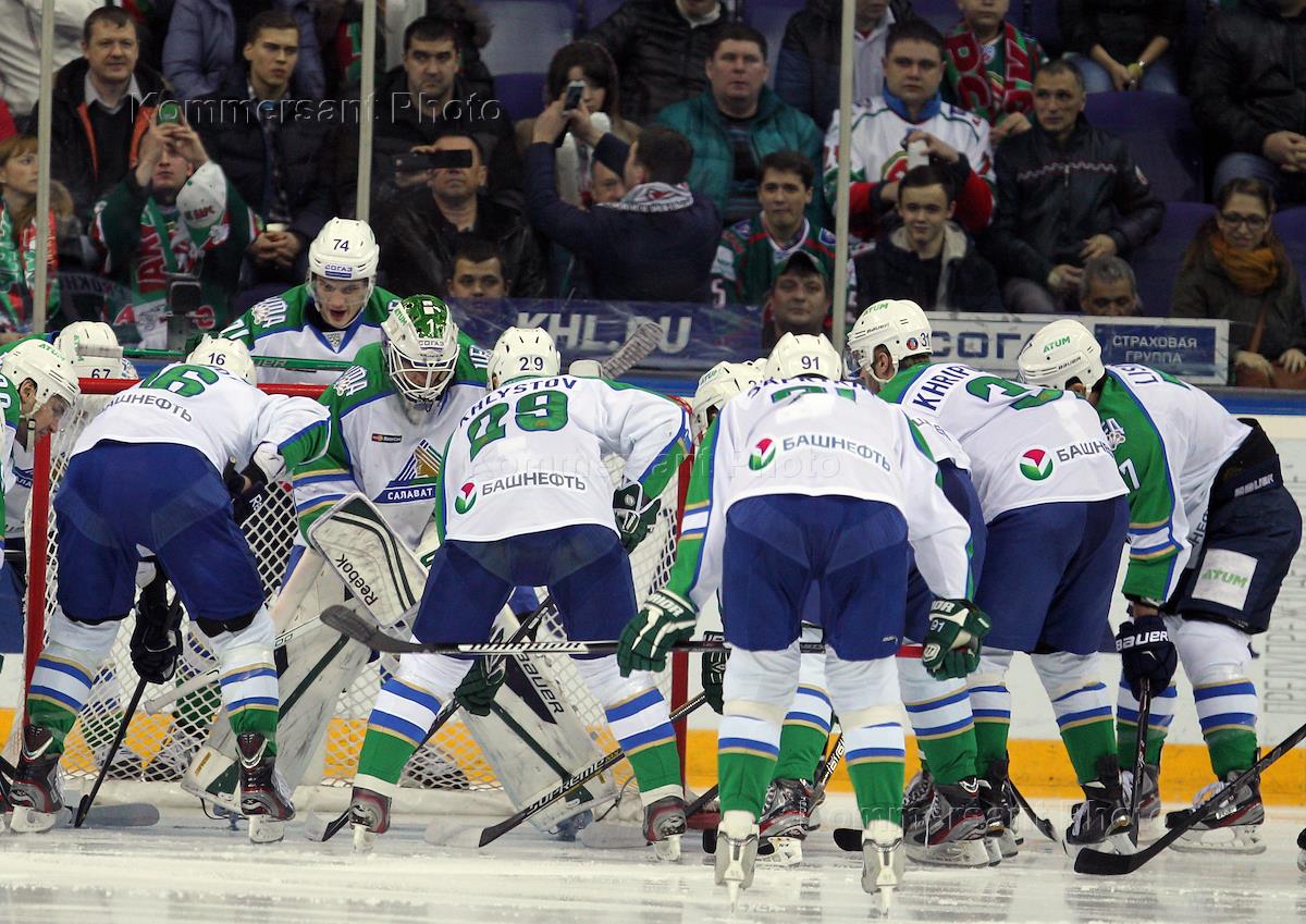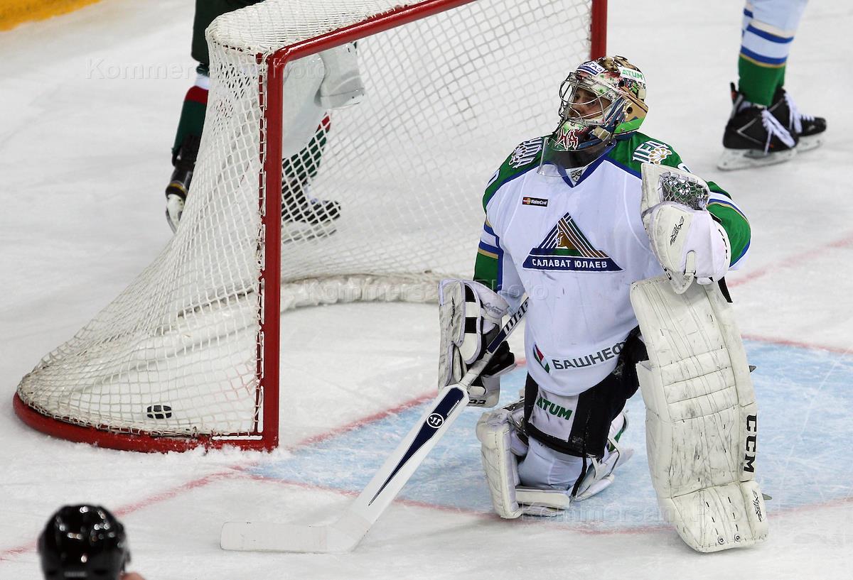 Континентальная хоккейная лига (КХЛ). Кубок Гагарина 2016. 1\8 финала. Матч между командами "Ак Барс" (Казань) и "Салават Юлаев" (Уфа). Вратарь "Салават Юлаев" Владимир Сохатский во время игры.
