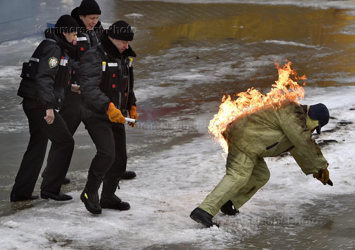 Сотрудники МЧС во время учений на территории многофункционального миграционного центра в деревне Сахарово.